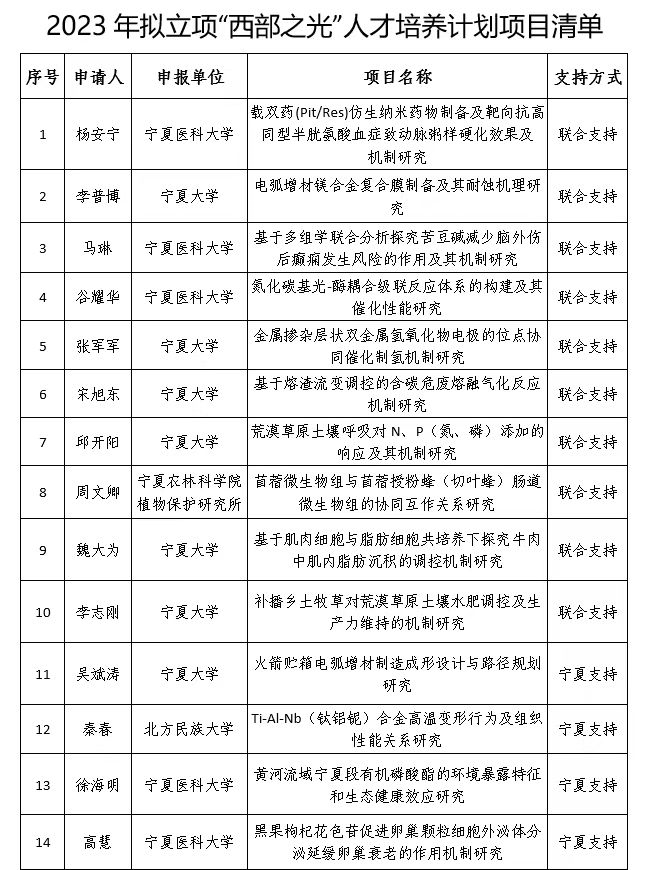 近日,宁夏科学技术厅公布了2023年中国科学院“西部之光”人才培养计划拟立项项目,宁夏共有14人获得资助,宁夏大学7人获批资助,其中澳门威尼斯人