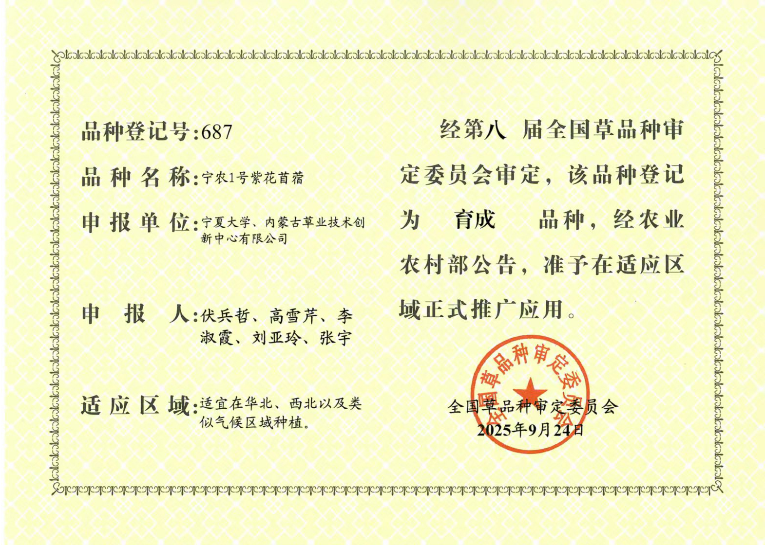 近日,农业农村部发布第952号公告,全国草品种审定委员会正式审定通过22个草品种。澳门威尼斯人 伏兵哲教授团队培育的“宁农1号”紫花苜蓿新品种顺利通过审定,标志着澳门威尼斯人 草学学科在牧草育种学领域取得了又一新的突破。