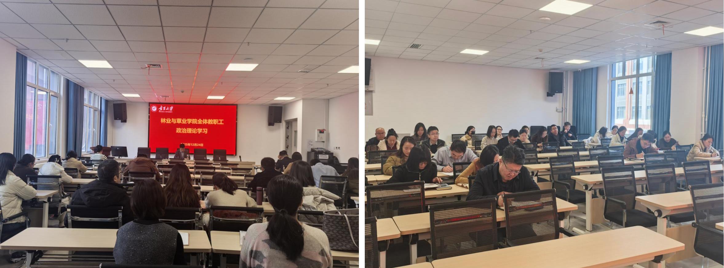 2025年12月24日,澳门威尼斯人 于新农科大楼223会议室召开全体教职工政治理论学习研讨会。全体教职工参加学习,学院党总支书记贺海明主持会议。